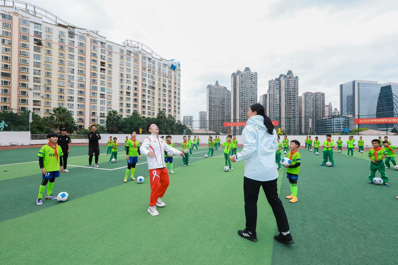 操场上的互动更加热烈,“冠军开球”环节登场,奚爱华、王娇、郭伟阳三位冠军分别将球抛向场边第一排的足球队员。接到球的队员迅速进入状态,熟练地颠起球来;后排的足球队员们则同步展开踩球练习,脚掌轻贴球面,动作整齐划一。郭伟阳回忆道:“我们以前训练间隙也常玩抛球接球的游戏,既能放松,又能练反应!”说着,他主动走进场中,亲自示范抛接球动作,一举一动间尽显奥运健儿的专业风采,引得同学们阵阵欢呼。