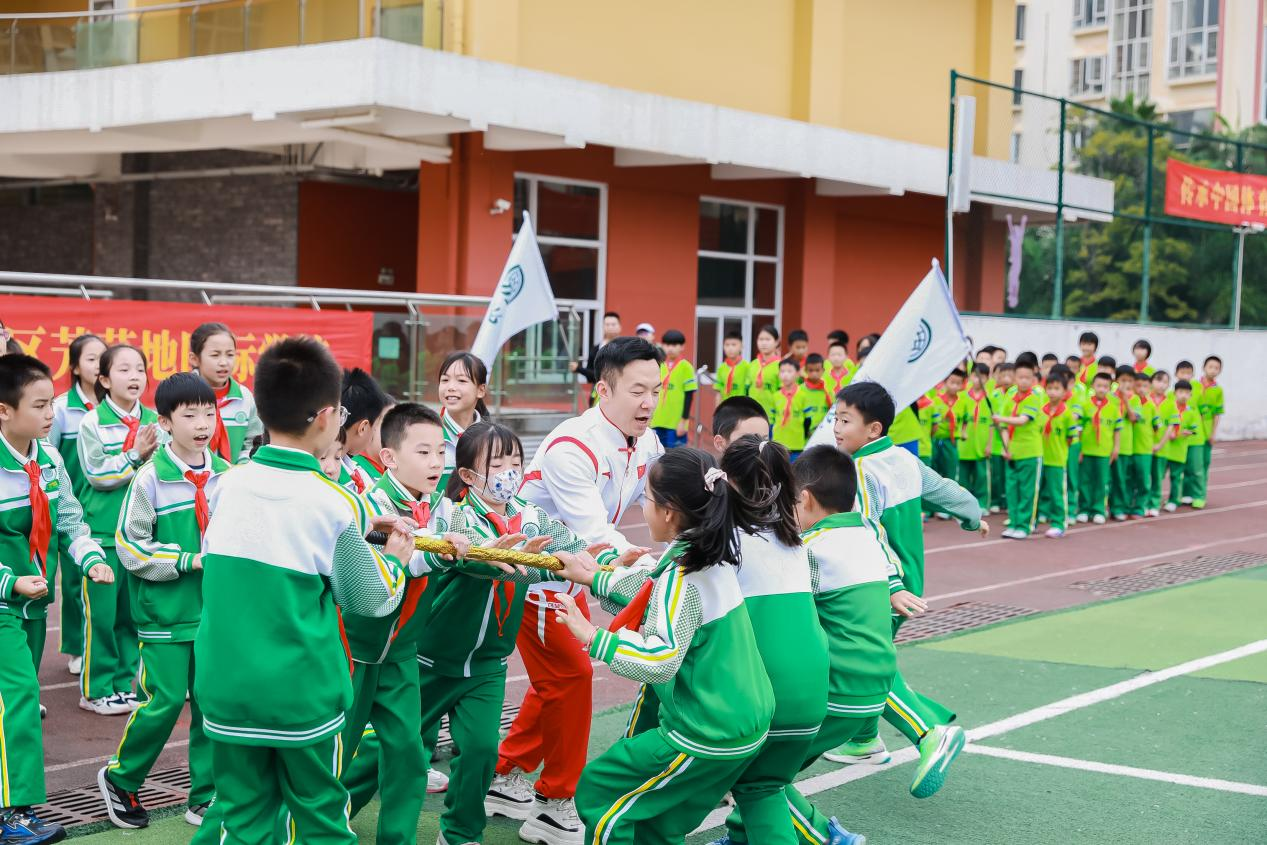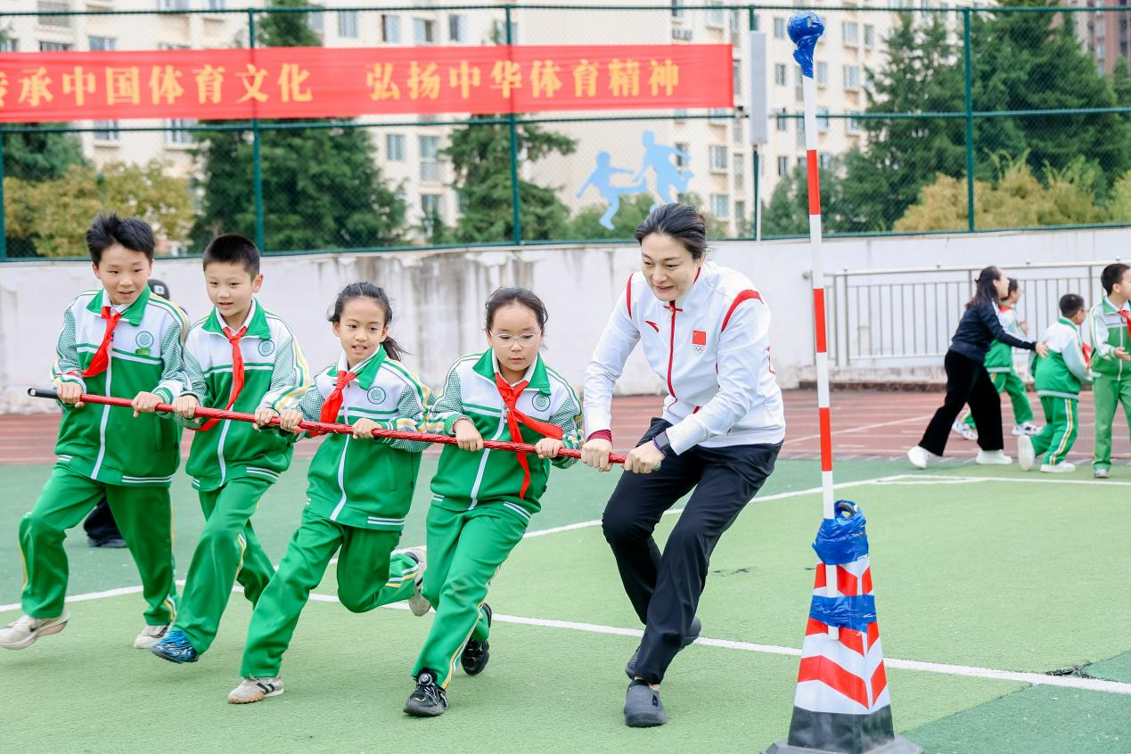 “齐心协力”团体竞技赛游戏更是点燃了奥运冠军们的好胜心,冠军们带着各自阵营的孩子摩拳擦掌,更是高喊口号。随着裁判一声令下,三支战队同时出发。王娇战队的五人配合默契,起步节奏一致,长杆始终稳稳握在手中,奔跑中不时互相提醒“保持同步”;奚爱华战队则凭借赛艇项目练就的团队协作本能,调整步伐频率,不相上下;郭伟阳战队一边奔跑,一边笑着鼓励身边的学生“别紧张,我们跟着节奏来”。场边师生们的加油声此起彼伏,呐喊声不绝于耳。