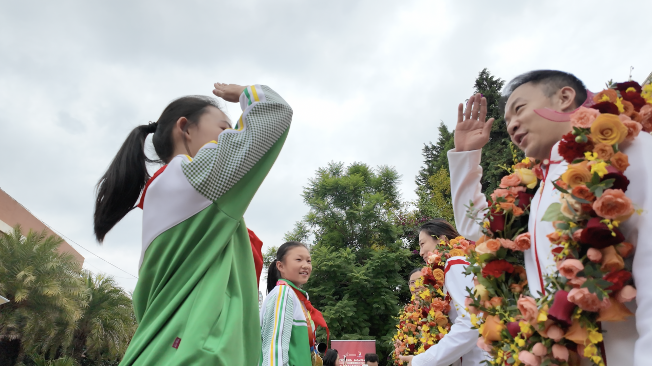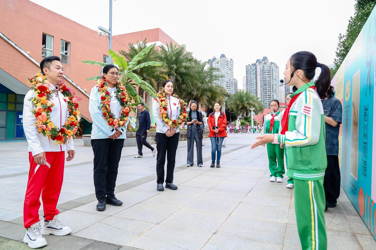 刚一踏入学校,在热烈的欢迎声中,学生们向奚爱华、王娇、郭伟阳三位奥运冠军献上花环,身着云南少数民族服饰的学生们将“民族”与“国际”的校园特色融为一体。随后,奥运冠军与师生共同驻足中国体育博物馆精心设计制作的“体育六艺展板”前,六位学生讲解员从容上前,以生动鲜活的语言解读古代体育文化内涵。芳草小舞台上,灵动的民族舞蹈伴着欢快节奏上演,鲜明的地域风情瞬间点燃现场氛围。