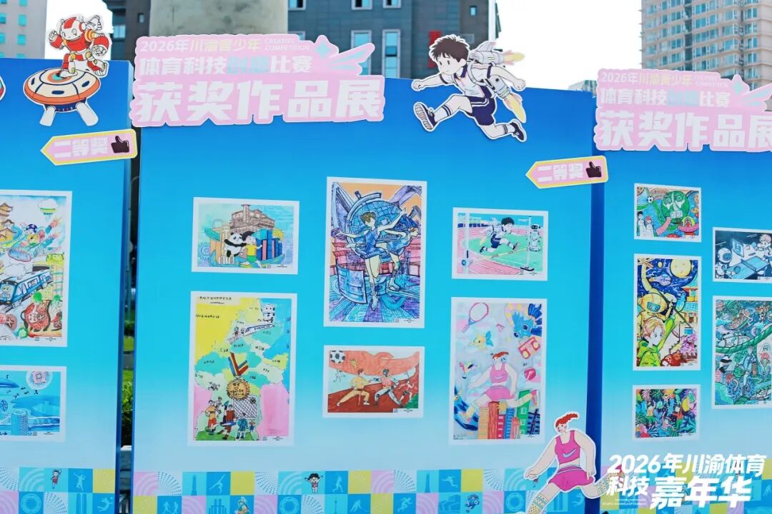 小朋友将童心与创意融入体育科技,描绘出未来赛场、星际运动等多元场景。《博观——船舶大调查(探秘珐伊28R)》探索赛艇的秘密;《滑板星航-科技运动》用动感构图与鲜明色彩,展现科技与体育碰撞下的少年活力;《星际火锅体能补给站》将家乡烟火气与未来运动补给理念结合,打造了一座星际间的山城活力补给站……这些作品尽显少年奇思妙想,汇聚起川渝青少年的热爱与期望。获奖作品将在现场展出,4月19日上午将举行颁奖仪式。