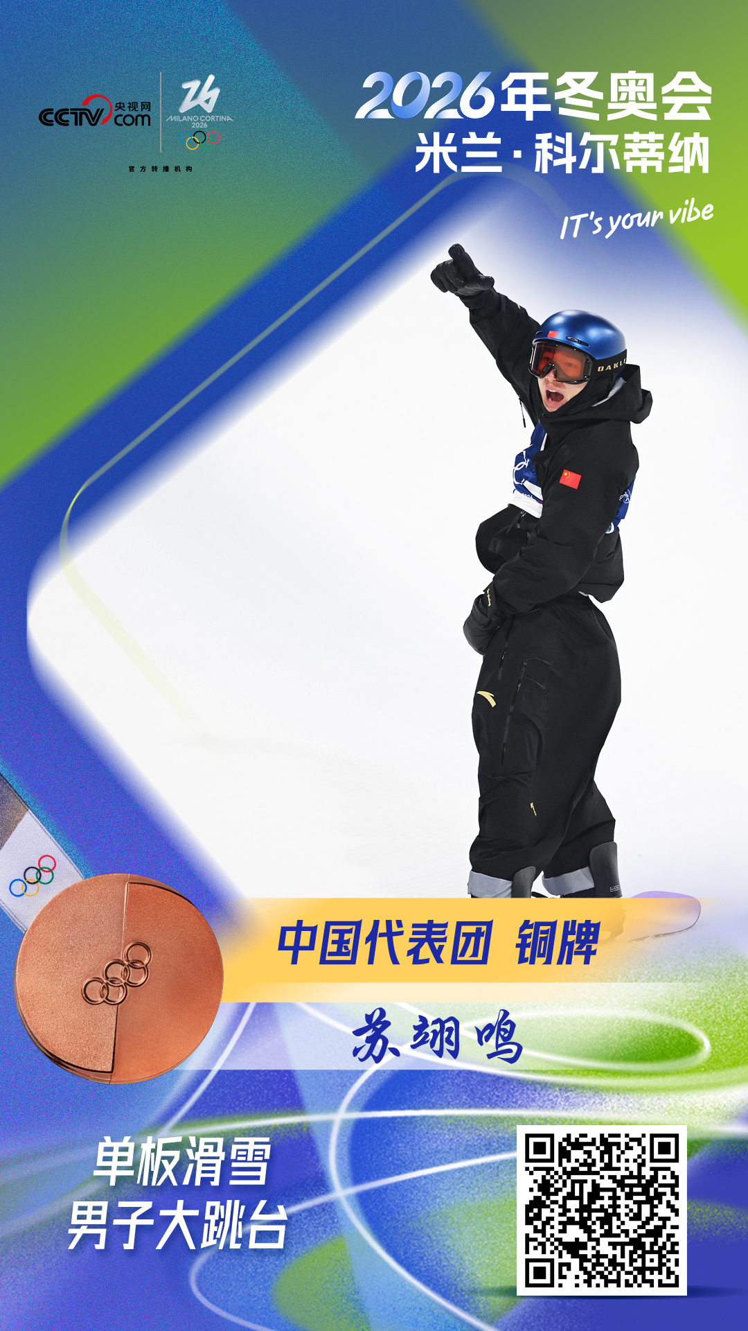 央视网消息:米兰-科尔蒂纳冬奥会单板滑雪男子大跳台决赛,中国选手苏翊鸣获得铜牌。