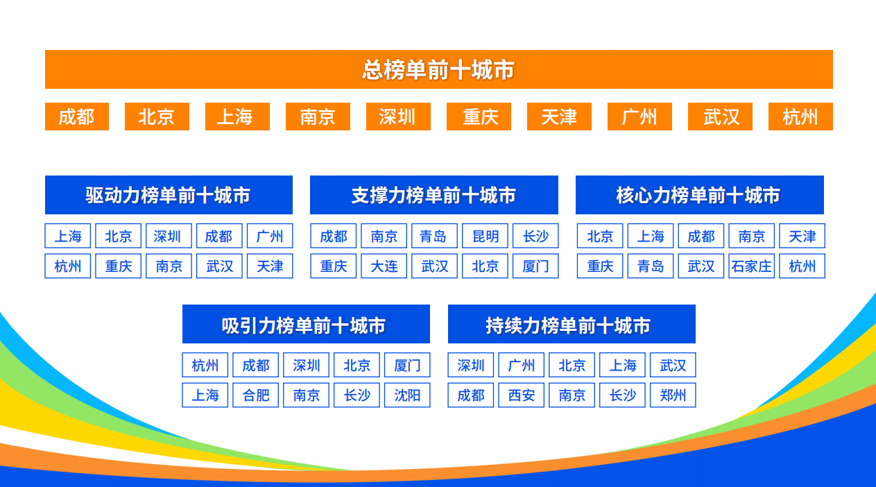 本年度总榜单前十的城市依次为成都、北京、上海、南京、深圳、重庆、天津、广州、武汉、杭州。